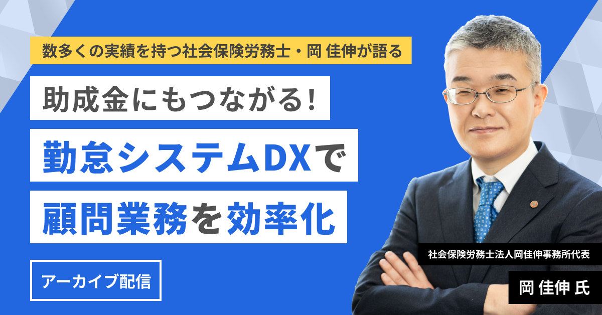 数多くの助成金支援に携わってきた社会保険労務士の岡 佳伸先生が、クラウド勤怠システムを活用した顧問業務の効率化と、助成金申請を有利に進めるための具体的なノウハウをわかりやすく解説します。
